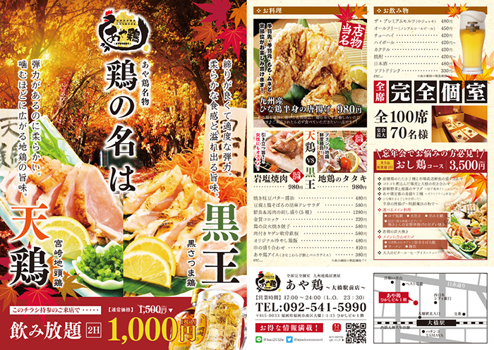 九州鶏料理居酒屋「あや鶏」様 フライヤー メニューチラシ・フライヤーポスターパンフレット・冊子ショップカード看板タペストリーPOPキッチンカー 関連記事 READ MORE チラシ・フライヤー 中国菜品「空心房」様 チラシ READ MORE チラシ・フライヤー 「鶏きち魚きち」様 歓送迎会フライヤー READ MORE チラシ・フライヤー 九州リゾートダイニング「RED LINE」様 チラシ READ MORE チラシ・フライヤー 「あや鶏&かこみ庵」2店舗合同新聞折込チラシ 制作実績一覧はこちら
