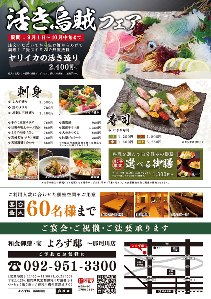 和風御膳宴「よろず邸」様 チラシ メニューチラシ・フライヤーポスターパンフレット・冊子ショップカード看板タペストリーPOPキッチンカー 関連記事 READ MORE チラシ・フライヤー 中国菜品「空心房」様 チラシ READ MORE チラシ・フライヤー 「あや鶏&かこみ庵」2店舗合同新聞折込チラシ READ MORE チラシ・フライヤー 「HAKATAおっしょい」様 OPENチラシ READ MORE チラシ・フライヤー 九州リゾートダイニング「RED LINE」様 チラシ 制作実績一覧はこちら