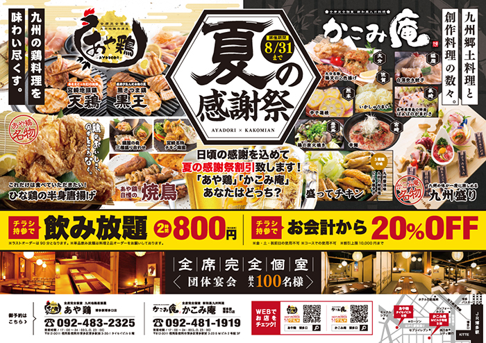 「あや鶏&かこみ庵」2店舗合同新聞折込チラシ メニューチラシ・フライヤーポスターパンフレット・冊子ショップカード看板タペストリーPOPキッチンカー 関連記事 READ MORE チラシ・フライヤー 九州鶏料理居酒屋「あや鶏」様 フライヤー READ MORE チラシ・フライヤー 「鶏きち魚きち」様 歓送迎会フライヤー READ MORE チラシ・フライヤー 「熊本酒馬 ゆきち」様 弁当チラシ READ MORE チラシ・フライヤー 「HAKATAおっしょい」様 OPENチラシ 制作実績一覧はこちら