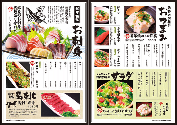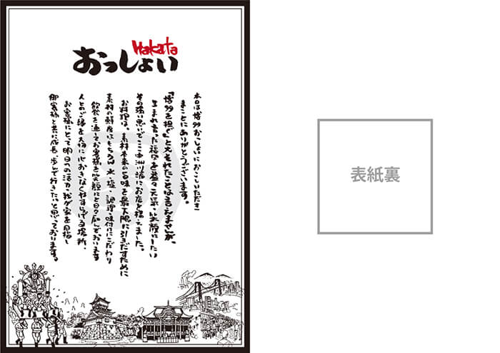 「HAKATAおっしょい」様 グランドメニュー メニューチラシ・フライヤーポスターパンフレット・冊子ショップカード看板タペストリーPOPキッチンカー 関連記事 READ MORE メニュー 「くろ屋~離れ~」様 ランチ&名物メニュー READ MORE メニュー 焼鳥と魚「博多いちえ」様 二つ折りメニュー READ MORE メニュー 大衆焼肉「かまど屋」様 ランチメニュー READ MORE メニュー 鹿児島の台所「くろ屋」様 メニュー 制作実績一覧はこちら